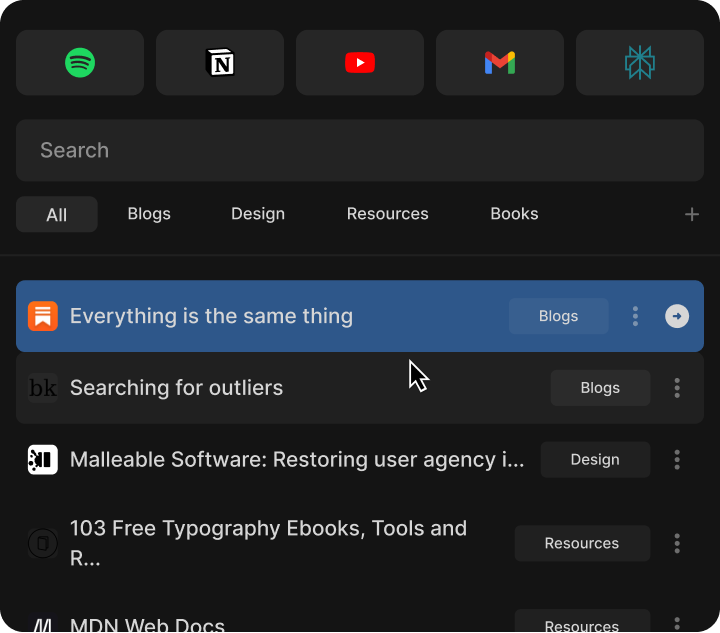 A browser extension that I built for hanlding my bookmarks. I find the built in bookmarks feature inefficient and really hard to maintain, especially when you keep a lot of bookmarks like I do.